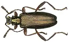 Adult beetles are 7–12 millimetres (0.28–0.47 in) in length. Elytron is rounded completely on top. Hind femur reaching apex of elytron, which have no teeth. Elytron have no indentations. Antenna and legs are reddish-colored, the top is bronze-green.