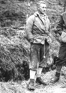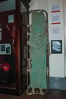 Donald Duff began climbing in Snowdonia, mainly with the Midland Mountaineering Association, took part in mountain recues in N. Wales, and designed the stretcher that bore his name.[1] In 1945 he became a general surgeon in the Belford Hospital, Fort William and joined The Scottish Mountaineering Club, he became involved in mountain rescue both as a rescuer and a surgeon treating casualties. In 1945 he assumed leadership of the recently formed Lochaber Mountain Rescue Team, Scotland's first civilian volunteer team.[1] The following year he patented his light weight mountain stretcher.[5] The Duff stretcher rapidly became standard equipment in Scottish Mountain rescue until replaced by that designed by Hamish MacInnes.[6] The Scottish Mountain Heritage Collection based at Roy Bridge has an example that was kept at the Steall Hut in Glen Nevis[7] His S.M.C. obituary notes that a Duff stretcher was taken on the 1953 Everest expedition, something in which he took pride. In 1956 Duff received the M.B.E. for services to medicine.[8]
