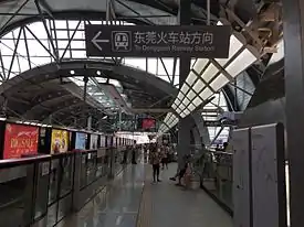 Dongguan Rail Transit or Dongguan Metro is the rapid transit system of the city of Dongguan in Guangdong Province of China. It is operated by the state-owned Dongguan Rail Transit Corporation, Limited. The construction of the first section of Line 2 began on 26 March 2010,[2][3] opening on 27 May 2016.[4] Current plans call for some lines of the Dongguan Rail Transit to connect with the neighbouring Shenzhen Metro and Guangzhou Metro.[5]