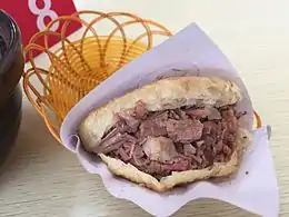 The donkey burger (Chinese: 驴肉火烧; pinyin: lǘròu huǒshāo) is a kind of sandwich commonly eaten in Baoding and Hejian, Hebei Province, China,[1][2] where it is considered a local specialty, though it may also be found in other parts of China, particularly in northeastern China.[1][3] Chopped or shredded donkey meat or offal is placed within a huǒshāo or shao bing, a roasted, semi-flaky bread pocket,[1] and eaten as a snack or as part of a meal. Hejian style typically serves the meat cold in a warm huoshao while Baoding style serves the meat hot, they both often include green chili-pepper[1] and cilantro leaves. Donkey burger is a popular street food[3] and can also be found on the menus of high-end restaurants.