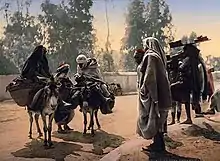 The donkey (Equus asinus) has always been a part of the rural countryside of North Africa.[1] However, the origin of domesticated donkeys in the Maghreb is disputed. According to one theory, supported notably by l'Encyclopédie berbère, the domestic species is not native to the region, and is descended from the African wild donkey (E. africanus), whose origins are found in East Africa.[1] According to the theory of Colin Groves (1986), a sub-species of the North African wild donkey (Equus africanus atlanticus) had lived until the first few centuries AD, but it is not known if it was domesticated, and it seems very unlikely.,.[2][3] There are no archaeological remains of this subspecies so it can only be depicted through representations.[4] Originating in the Atlas Mountains, E. a. atlanticus went extinct around 300 AD.[3] Whatever its exact origins, the donkey was domesticated in Africa,[5] the oldest proof of its use going back to the culture of Maadi-Bouto, in Egypt, in the 4th Millennium B.C...[6] The history of the donkey in Africa is notoriously difficult to study as, although the species was widely used, very little was written about it, no plans for the development nor for the improvement of the species were developed, and very few archaeological remnants are left.[5] There are no remains to document its existence in the Tunisian Sahara.[7] The first domesticated donkeys, who originate from arid or semi-arid regions, are very sensitive to humidity.[5]