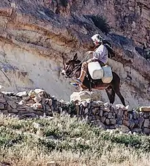 The donkey still plays a major role in domains such as transport for minor agricultural work, as well as in ground work.[23] Known for their temperance and hardiness, donkeys are used by the poorest Tunisians to travel or to carry water with a pack saddle, a barda or a zembil. .[15] They may be a necessity in subdesert regions and steppes in order to access water. Well-drilling zones can be up to several kilometres away from inhabited areas and transporting water is achieved either by a tank wagon made from tinplate supported by two wheels, or via amphora urns (or more recently, via plastic water containers) which are filled up and brought back by women on the backs of donkeys.[24] The donkey is used less and less frequently in rural areas, reserved only for tasks such as gathering olives, with cars being used for day-to-day transport.[21]