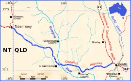 The road branches from the Diamantina Developmental Road 7 km (4 mi) north-west of Boulia and proceeds towards the Northern Territory. The Georgina River is at about the 166 km mark and 83 km further is Tobermorey, a town with 20 inhabitants. From here the trail continues as the Plenty Highway towards Alice Springs.[1] The route is mostly unpaved and marked by corrugations, deep potholes and bulldust (fine red desert dust). However, in 2009 further development in the form of river crossings were initially attached and further parts of the road are paved.[2] Despite the improvements to the track, it is often impassable after heavy rain.[3]