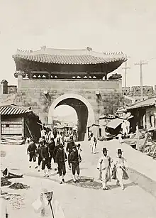 Donuimun was originally built in 1396. It was burned as a result of the 16th century invasions by Japan, but was rebuilt in 1711.[1] In 1413, the gate was closed. In 1422, Donuimun gate was repaired. In 1711, Donuimun Gate was rebuilt in 1711.[2] In 1915, the gate was again destroyed during the Japanese colonial period. The gate was photographed at various times before its destruction, most notably by in a series of photographs taken by Presbyterian missionary Horace Grant Underwood in 1904. Some of these photographs show the tracks of an "American Electric Tramway" running through the gate.