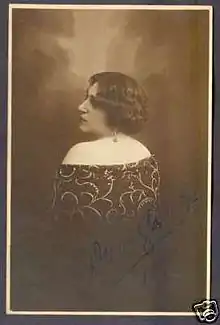 Dora Gález (1903–2002) was a pioneering Argentine actress and vedette. She was one of the first stars of the Maipo Theater, and given the title of the "nightingale of the house". Other early co-stars with whom she worked were Carmen Lamas, Gloria Guzmán and Tita Merello.[1] In 1924, she was in the cast of Roberto L. Cayol's Revue ¿Quién dijo miedo? which featured music by Arturo De Bassi along with Iris Marga, César Fiaschi, Carmen Lamas, and the debut performance of Tita Merello.[2]
