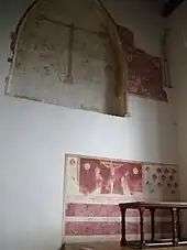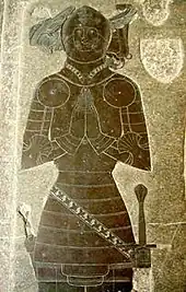 Other fittings include one of the few surviving lead fonts in England, frescoes of 1340 and several monuments, especially the well-known "swaggering knight" effigy formerly believed to be Sir John Holcombe who died in 1270 but it is more likely that it is William de Valence the Younger (died 1282 [2] at the Battle of Llandeilo Fawr), son of William de Valence, 1st Earl of Pembroke.