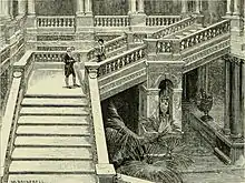 - "The staircase itself is of marble and the steps having broad treads, moderate nosings and very low risers. A flight runs parallel to one side of the gallery to the angle of the wall where there is a landing, and then another flight parallel to the other side to the first floor, with an intermediate landing supported on small open arches. The balustrade is of marble with a broad flat handrail and dwarf pillars with swelling bases"[5]