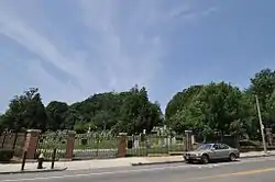 The Dorchester South Burying Ground is a historic graveyard on Dorchester Avenue in the Dorchester neighborhood of Boston, Massachusetts. Established in 1814, it is the second oldest cemetery in Dorchester, after the North Burying Ground. It is a roughly 2-acre (0.81 ha) parcel on the west side of Dorchester Avenue, north of Dorchester Lower Mills. A paved roadway provides circulation around the perimeter of the property. There is some evidence that the cemetery was formally terraced, due to the sloping terrain, but there is no evidence of curbing that might have been used for this purpose. One of the cemetery's most prominent features is a line of granite tombs along the southern boundary.[2]