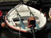 It is a clinker-built boat, typically around 4.5 m (15 ft) long and 1.5 m (4.9 ft) broad. It has at least a two-man crew: a skipper who handles the tiller (which extends forward from the stern under the hull), and a seaman who manages the headsail. It may, however, have a crew of three or four. It has oars for propulsion for when there is no wind. Modern boats may be fitted with an auxiliary outboard motor. Swedish scholar Staffan Mörling and Galician scholar Xaquín Lorenzo have suggested that the design may have been inspired by that of Viking 'dragon ships'.
