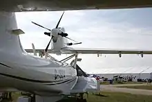 The Seastar's fuselage is composed of a fiberglass composite material, which is corrosion-proof as well as being less prone to leaks in comparison to rivetted metal hull counterparts.[4][23] Unlike typical floatplanes, which are often conversions of land-based aircraft, the Seastar has a low vertical center of gravity, achieved in part by carrying all of its fuel within its sponsons instead of the wings.[23] The sponsons, which provide stability while submerged on the water, are shaped to break surface tension and to generate considerable lift during the acceleration performed during takeoff; they also accommodate the main landing gear. Other flying boats often retract the landing gear into the hull instead.[23] The landing gear can be optionally removed and reinstalled when needed; a special 'water mode' for the landing gear is also present which prevents their deployment during a water-based landing.[23]
