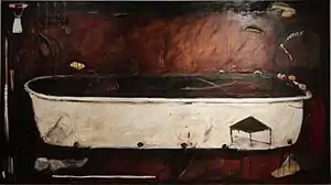 Most of Faison's art is multimedia. She was greatly influenced by her exposure to the native American cultures of Latin America, especially the Aymara and Quechua, whose rituals combined Christianity, mysticism and magic.[2] Her painting Guardian of the Break, in the Hawaii State Art Museum is an example of the artists use of a varied mix of media to create a complex surface.[6] It was created with oil paint, alkyd, pigments, charcoal, watercolor and dog hair on canvas. This large (60 in × 110.75 in [1,524 mm × 2,813 mm]) painting also demonstrates her use of symbols laden with allusions and personal meanings. The large central object could be either a bathtub or a sarcophagus.[2] The Hawaii State Art Museum and the Honolulu Museum of Art[7] are among the public collections holding work by Dorothy Faison.