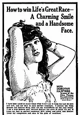 In June 1920 another full-page Rexona soap advertisement featuring Hawtree was published in Brisbane's Daily Mail.[20] Further Rexona advertisements in various formats, featuring illustrations of Hawtree, were published in November and December 1920 in Sydney as well as Melbourne.[21] The advertising copy was updated to inform readers that "Miss Hawtree is the winner of the Olive Thomas Beauty Contest, and has a great future predicted for her in motion pictures".[22]