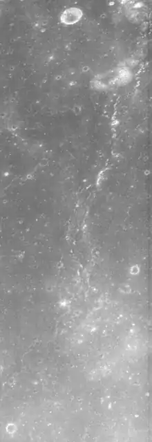 Oblique view from Apollo 8, at the lunar terminator, with Dorsa Barlow in the foreground, Vitruvius crater at center, and the Montes Taurus in the background.