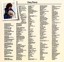 Dory Previn is a solo studio LP by Dory Previn, released in 1974.[4][5] It was her first album for the Warner Brothers label, having left United Artists.[6][7]