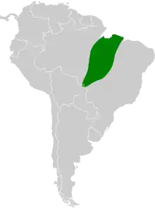 The dot-eared coquette is found primarily in Brazil, from the mouth of the Amazon River in Pará south and west to Mato Grosso and Goiás.[6] It has been recorded as a vagrant in Bolivia's Santa Cruz department.[5] It inhabits semi-open to open landscapes such as forest edges, savanna, and cerrado from sea level up to about 800 m (2,600 ft) of elevation.[6]