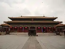 The idea of "Tian Kuang Jie" was originated after Qin Shi Huang, the first emperor of China, went to Mount Tai to offer sacrifice to Heaven and announce the relation between the emperor and heaven.[2] The Dai Temple was built as the site of this ritual. The ritual itself became compulsory for every emperor of succeeding dynasties, and by offering sacrifice to heaven on Dai Temple, emperors are emphasizing their special relation with heaven— "the self-assumed son of heaven."[2] In the Song dynasty, emperor Zhao Heng claimed that he received scriptures from heaven at June 6,[5] and he reconstructed Dai Temple and renamed the main hall as Tian Kuang Hall to prove his religious and appreciation to heaven.[18] The temple was further renovated and expanded by all Zhao Heng's offsprings and emperors in succeeding dynasties.[19]