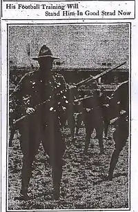 By 1917, Bomeisler had recovered sufficiently from his injury to enlist in the U.S. Army following the entry of the United States into World War I. After initial training at Plattsburgh, New York, Bomeisler was assigned to Camp Upton at Yaphank on Long Island, where he also played on the camp's football team along with former Harvard football star Bob Storer.[21] Bomeisler' photograph, practicing a bayonet charge, was published under the headline, "His Football Training Will Stand Him In Good Stead Now."[22] The article noted: "If Bomeisler ever gets a chance for action he, no doubt, will account for a few of the enemy. He is one of the finest specimens of manhood at the officer training camp. … Those who have seen him here say that he will make a splendid soldier."[22]