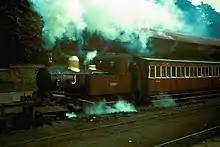 The buildings to the rear of the locomotive sheds house the carpenters' shop and paint shop where all the in-house painting and signwriting is carried out by the railway's own staff. A smaller stone-built shed houses more storage facilities and atop this building are the two (now unused) water tanks for the shed complex which remain as a reminder of busier times. The side of the water tank base originally carried a large bracket signal governing entry into the station, but this was damaged and then removed c.1981. What once formed a gap between the sheds was covered over in 1999 to provide further secure accommodation for rolling stock and this has been constructed from corrugated metal and is used to house some of the railway's redundant items of rolling stock including one of two Empress Vans and frames off out of use locomotives.