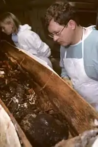 Following his professor's lead, Owsley assisted with the excavation, using tools to carefully remove the surrounding soil and organic materials to reveal the remains of two Native Americans wrapped in buffalo robes. Careful not to disturb or move the remains, they photographed the bodies to document the exact position in which they were found. After returning to the university campus, Owsley switched his major from pre-med to anthropology.[33]