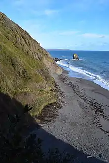 Past Coleadon is a 600 metres (660 yd) stretch of beach which ends in a rocky outcrop known locally as "Shag Rock" after the seabirds who can be seen sitting on the rock drying their wings after diving for fish. This marks the end of easy foot access to the coastline. There is a path up the cliff which leads to the road above this beach, the climb is pleasant but reasonably strenuous. The ruins of an old Victorian lodge, known as "St Germans Hut", can be found halfway up this cliff path.