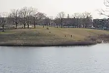 The park features a large man-made pond on the Keele Street side. Although it is an artificial body of water, the water from it flows out to the Downsview Dells ravines and eventually into Black Creek.[14]
