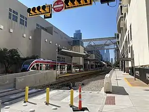 Downtown (or Downtown-Convention Center) is a Capital MetroRail commuter rail station in Austin, Texas. It is located in Downtown Austin at the corner of Fourth and Neches Street behind the Austin Convention Center. It is the current southern terminus of the Red Line. It was also the smallest, but busiest Capital MetroRail station, before it was rebuilt and expanded.[4]