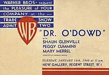 Dr. O'Dowd is a 1940 British drama film directed by Herbert Mason, produced by Sam Sax for Warner Bros and starring Shaun Glenville, Peggy Cummins, Felix Aylmer and Irene Handl. Set in Ireland, it focuses on Marius O'Dowd, an Irish doctor, who works to restore his relationship with his son after his daughter-in-law dies under O'Dowd's care. The film was the onscreen debut for Peggy Cummins, who was only thirteen at the time.[1] It was well received by critics, and Cummins' role was the subject of particular praise. The film is currently missing from the BFI National Archive, and is listed as one of the British Film Institute's "75 Most Wanted" lost films.[2]