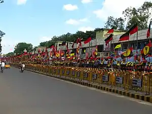 The party at its inception retained the flag of the South Indian Liberal Federation, which had a picture of a traditional type of balance signifying the idea of equality.[29] Its central theme was to remove the degraded status imposed on Dravidians. To communicate this, the party adopted a black flag with a red circle inside it, with the black signifying their degradation and the red denoting the intention of the movement to uplift Dravidians.[30]