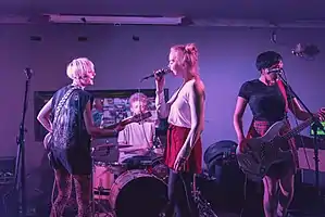 Dream Wife is an English, London-based band, whose sound is a mixture of punk rock, pop music and indie rock.[3][4][5] The band consists of Rakel Mjöll (lead vocals), Alice Go (guitar, vocals), and Bella Podpadec (bass, vocals).[6] They have been supported by Alex Paveley on drums since 2018.[7][8]