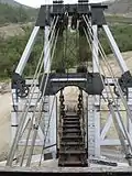 Gold was recovered in a rotating 49.5-foot (15.1 m) long trommel screen with 9.75-foot (2.97 m) diameter and 12.5% grade.[14] A pipe was suspended within the trommel, carrying water upwards to spray the incoming material, cleaning it and breaking up larger lumps.[15] Finer material (gold, sand, and pebbles) was sieved through 0.75-inch (1.9 cm) holes in the screen, which rotated at 7.8 revolutions per minute, into a distributor box.[15] From there, it flowed into sluice tables, long troughs with an area of 1,705 square feet (158.4 m2) which had a constant flow of water.[14][15] About 75% of the gold was caught in a 4-foot (1.2 m) coconut matting and steel riffles at the bottom of the troughs.[15] A smaller distributor captured another 20% of the gold, and all remaining material was washed out into the dredge pond.[15] The larger pieces of gravel were ejected from a 32-inch (81 cm) wide stacker at its rear, a 131-foot (40 m) belt moving at 356 feet per minute (1.81 m/s).[16] These tailings remain as a "vast, rippled blight on the landscape".[3] Particles of gold and nuggets too large to fit through the screen holes would be ejected with the gravel.[7]