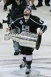 In addition to missing training camp, Doughty suffered a concussion early in the season that forced him onto injured reserve.[14] He struggled upon his return from the injury and faced criticism that he had allowed his physical conditioning to lapse. Doughty himself admitted that he was not enjoying the game early in the season. He said that his season turned a corner when the team replaced Murray with Darryl Sutter, a coach who preached the need for preparation.[23] Doughty was elevated into a role where he was expected to shut down the opposition's top forwards, forcing him to focus more on his defensive play than his offensive. Consequently, Doughty's 36 points on the season was his lowest total in three years.[14] He was the top-scoring defenceman in the 2012 Stanley Cup playoffs, however, recording 16 points in 20 games to help the Kings win the first Stanley Cup championship in franchise history.[24] Doughty was praised as the top player for either team in the final series, a six-game victory over the New Jersey Devils.[25][26]
