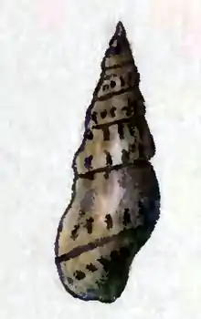 The shell has a rather pyramidal shape. It is highly polished. The upper portion of the whorls are flat, clouded with reddish brown and white. The lower portion are more prominent, encircled with a row of irregular reddish brown dots. The body whorl is encircled with two rows of dots. The aperture is short. The siphonal canal is very short.