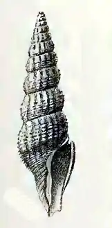 The attenuated, grayish-white shell has a fusiform shape. It contains 11 whorls, of which two in the protoconch. These two apical whorls are vitreous and dark. The other whorls are convex and crossed by oblique, symmetrically arranged ribs. There are only few in the upper whorls, but numerous (up to fifteen) and of a brown color in the penultimate whorl and in the body whorl They are crossed by transverse nodulose lirations. There is no beading at the sutures. The body whorl shows a dorsal varix close to the outer lip. The long, narrow aperture is white on the interior. The outer lip is slightly effuse and distinctly sinuous. The siphonal canal is wide and short. The columella is straight. .[1]