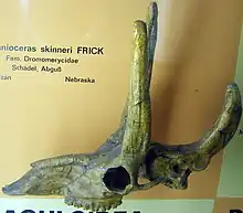The Dromomerycidae is an extinct family of Neogene ruminants belonging to the infraorder Pecora. Dromomerycids, known by two subfamilies, were endemic to North America from the later early Miocene up to the early Pliocene (~5 Ma), leaving no descendants. Dromomerycidae has a long history of uncertain taxonomic affiliations due to its superficial resemblances with the Eurasian Neogene Palaeomerycidae and were traditionally classified as subfamilies within the family. However, recent research differentiates the dromomerycids from the Giraffomorpha (Giraffoidea and Palaeomerycoidea) by the lack of sutures on the skull roof that typically make up the ossicones of the later clade. The similar resemblances of the appendages therefore could be the result of parallel evolution.[1][2]