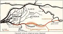 The idea behind the change of plan seemed to be that several overflow areas would no longer be necessary, and would remain dry every season. This would be very beneficial to somebody, but not for the local (water) authorities, which paid for part of the canal. They stated that the new plan blocked drainage of the Beerse Maas to the Baardwijkse Overlaat, and that the Hedikhuizen plan did not.[13] This way they thought they paid for better drainage upstream, but lost the advantage of having their lands irrigated with fertile Meuse water, instead of the water from Aa and Dommel, which did not deposit much fertile sediment.