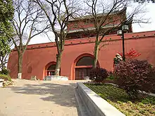The Drum Tower of Nanjing (simplified Chinese: 南京鼓楼; traditional Chinese: 南京鼓樓; pinyin: Nánjīng gǔlóu) on Gulou Mountain in the Gulou District of downtown Nanjing, was first built in the 15th year of the reign of Hongwu, of the Ming Dynasty (1382 AD).