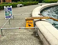 The fountain is utilized by mallards to raise ducklings, and every spring, the university would install a duck ramp to help ducklings enter and leave the raised edges of the fountain. Installed typically in April or May and maintained for approximately a month, the ramp allows sufficient time for the young ducklings to develop their flying skills and venture out of the pond.[4][5] The duck ramp comes after the university's unsuccessful attempts to remove the ducklings and the repeated arrival of additional ducks.[6]