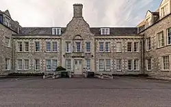 The foundation stone for the new building was laid by Alexander Bruce, 6th Lord Balfour of Burleigh in 1903.[5] It was designed by John More Dick Peddie and George Washington Browne in the Renaissance Revival style, built in rubble masonry and was officially opened on 3 October 1904.[6] The design involved a symmetrical main frontage of fifteen bays facing south towards the A9 road with the end bays projected forward as pavilions. The main frontage incorporated a three-bay central section which was slightly projected forward and featured a doorway with an architrave surmounted by a panel inscribed with the words "Let there be light". The panel was supported by brackets and flanked by obelisks. On the first floor, there was a central window flanked by Doric order pilasters supporting an entablature inscribed "MFS 1903" which was surmounted by a round headed hood mould. The inscription MFS recalled the main benefactor, Millicent Fanny Sutherland. The main frontage was fenestrated on both floors by sash windows. The end bays, which incorporated an extra storey, were fenestrated by three sash windows on the ground floor and by single sash windows on the first and second floors. At roof level, the three-bay central section was surmounted by a stepped gable with a central stack at the apex.[1] Meanwhile, Dummuie House was converted for use as the home of the headmaster of the technical school.[3]
