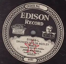 The song became popular on land in America as well. A catalogue of "folk-songs" from the Midwest included it in 1915, where it was said to be sung while dancing "a sort of reel".[18] More evidence of lands-folk's increasing familiarity with "Drunken Sailor" comes in the recording of a "Drunken Sailor Medley" (c. 1923) by U.S. Old Time fiddler John Baltzell. Evidently the tune's shared affinities with Anglo-Irish-American dance tunes helped it to become readapted as such, as Baltzell included it among a set of reels.