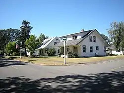 The first 58 houses in the village were built in 1909, including particularly large houses for the plant superintendent and assistant superintendent.[4] Construction continued over the following decade with six more houses in 1912, six more in 1915, and 33 more in 1916. By 1917, the company town also had two stores as well as a butcher shop, club house, hotel, playground, school, and church. Generally, the size of a worker's house correlated with the position of the worker in the company hierarchy, with most lower-level workers living in smaller houses while workers in management positions at the plant living in larger houses.[2] DuPont named the village streets after important people in the company or other plants run by the company. For example, Brandywine Ave was named after Brandywine Creek in Delaware, the site of DuPont's first gunpowder plant; Santa Cruz street was named after a plant in California; Penniman Ave was named after Russell S. Penniman, chemist and manager of DuPont's west coast operations; and Barksdale Ave was named after Hamilton Barksdale, a company executive who helped select the location for the Pacific Northwest dynamite plant.[2][4]