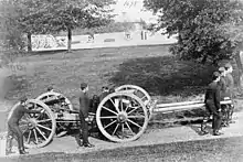 Under the sweeping Haldane Reforms of 1908, the Militia was replaced by the Special Reserve, a semi-professional force whose role was to provide reinforcement drafts for Regular units serving overseas in wartime. Although the majority of the officers and men of the Dublin City RGA (M) accepted transfer to the Special Reserve Royal Field Artillery, becoming the Dublin City Royal Field Reserve Artillery on 30 August 1908, all these units were scrapped in 1909, the Dublin unit disbanding on 11 December.[1][5][7][25][26][27] Instead the men of the RFA Special Reserve would form Brigade Ammunition Columns for the Regular RFA brigades on the outbreak of war.[28]