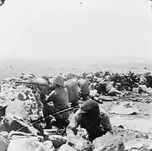The 1st, 6th and 7th Dublins all took part in the Allied Gallipoli Campaign in the Dardanelles after Turkey joined the Central Powers in November 1914. It was an effort to support Russia by keeping the Dardanelles Strait open. The 1st Dublins, as part of 86th Brigade of the 29th Division, landed at V Beach, Cape Helles on 25 April.[21] The 1st Dublins were the first to land, landing via boats that were either towed or rowed, and suffered heavy casualties from a withering hail of machine-gun fire from the Turkish defenders, most not even getting out of their boats, while others drowned in the attempt, most due to the equipment they carried. The 1st Royal Munsters, two companies of the 2nd Royal Hampshires and a company of the 1st Dublins, landed from the SS River Clyde soon afterwards and were also decimated by machine-gun fire.[29] In spite of the severe casualties, the British forces managed to land large numbers of troops by nightfall. On the morning of 26 April the British force, including the Dublins, took the fortress, led by Lieutenant Colonel Doughty-Wylie, before moving onto the village of Sedd el Bahr. Lieutenant-Colonel Doughty-Wylie and Captain Walford (who helped organise the attack) both died at the moment of victory.[30] The 1st Battalion sustained just over 600 casualties within the first two days, out of a total of just over 1000 men that had landed. Nearly all of their officers, including Lieutenant Colonel Richard Alexander Rooth, had been killed on the day of the landings.[31] The Battalion and the 1st Munsters had suffered so heavily that they had to form a composite battalion known as the 'Dubsters' on 30 April.[21] Both battalions regained their identity the following month after they received a sufficient amount of replacements. During their time at Helles, the 1st Dublins took part in the numerous attempts to capture Krithia; the first attempt took place on 28 April.[32]