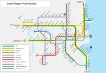 The Dublin Suburban Rail (Irish: Iarnród Bruachbhailteach Baile Átha Cliath) network, branded as Commuter, is a railway network that serves the city of Dublin, Ireland, most of the Greater Dublin Area and outlying towns. The system is made up of five lines: