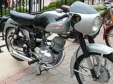 The series was envisioned as a "bare-bones low performance model,"[9] but the 98 Sport of 1953 became Ducati's "first true sporting model."[10] The new design by Ducati's chief engineer, Giovanni Fiorio, made its debut at the 1952 Milan Show with the showing of the 98N and 98T (with twin seat).[11] The following year, the 98 Sport was presented at the same show, a lighter bike with alloy instead of chrome steel rims,[5] and a higher state of tune, and the addition of a finned oil cooler at the front of the engine.[12][13]