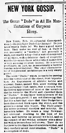 Dude is American slang for an individual, typically male.[1] From the 1870s to the 1960s, dude primarily meant a male person who dressed in an extremely fashionable manner (a dandy) or a conspicuous citified person who was visiting a rural location, a "city slicker". In the 1960s, dude evolved to mean any male person, a meaning that slipped into mainstream American slang in the 1970s. Current slang retains at least some use of all three of these common meanings.[2]