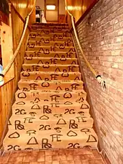 The "Stirrup Coffee Shop" restaurant was also part of the structure, and began operations in the mid 1950s.[4] Its original design also included a custom-made carpet and featured tooled oak furniture with cowhide seats and backs. It contained a soda fountain and patrons could observe food being prepared in the kitchen. Though the restaurant carpeting and some fixtures have changed, the ceiling lights with western images are original to the building, and most of the original tables and chairs are still in use. The horizontal neon sign that once graced the courtyard driveway entrance on North 29th Street was moved to the back entrance in 2000, when a second round of major remodeling occurred. The most significant change to the building occurred that year, when some of the brick on the south exterior wall was covered by board-and batten siding and a new entrance was built.[1] The new south wall, labeled the "branding wall", features actual brands from local area ranches, some applied in 2000 at the 50th anniversary celebration of the motel's opening, and others later, up through 2015.[5][6]