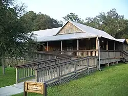 The Dudley Farm historic site is accessible from a trail near the visitor center, leading to a segment of the original, non-paved, Gainesville-Newberry Road. The Farm maintains a registered Cracker cattle herd, and currently three Florida Cracker horses. There are also chickens and turkeys on the farm. These are specimens of poultry breeds common on late 19th and early 20th century U.S. farms. During part of its existence, the farm was a large, local egg producer.[3] Several citrus trees, including two large, heritage Duncan grapefruit trees, represent the large commercial presence of citrus in north Florida during the 1840s-1890s. Other fruit crops grown on the farm during the Dudley period are also represented. These include figs, bananas, peaches, pecans and black walnuts.