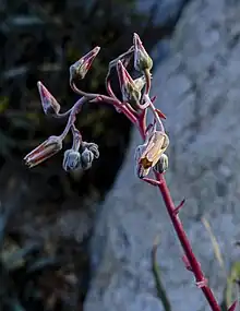 The peduncle is 10 to 30 cm tall to the cyme, 1.5 to 5mm thick, colored pink to red and often glaucous, with a variable shape depending on the subspecies. The lower 2 to 12 cm of the peduncle is bare, with 5 to 23 bracts starting above, ascending, triangular-ovate to -lanceolate, with the lower bracts 4 to 30 mm long, 3 to 12 mm wide. The cyme is commonly pinkish and glaucous, composed of 2 to 3 branches that bifurcate up to two times. The cincinni have 4 to 24 flowers, and in cultivation they open at intervals of 2 to 5 days, staying open for 5 to 6 days.[2]