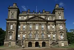 Duff House was designed by William Adam and built between 1735 and 1740 for William Duff of Braco.[2][3] The design and construction resulted in a legal dispute between the architect and owner which culminated in a legal case in 1743.[3] Construction began on 11 June 1735.[3] The design of the house originally intended to have flanking pavilions linked by colonnaded quadrants but these were never completed as the Earl thought the house would be too large.[3] This, along with further disagreements on the issue of mason work resulted in the legal case between the architect and Earl.[3]