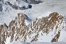 The first approaches to the summit were made from the northern slopes over the Gorner glacier via the Silbersattel (4,510 m). This pass was first reached on August 12, 1847, by Matthias and Johann zum Taugwald (guides from Zermatt whose name is also written "Zumtaugwald"), Johann Brantschen and Joseph Moser guiding the French professors Victor Puisieux and Edouard Ordinaire.[13] Precisely a year later (12 August 1848), Johann Madutz from Matt, Glarus, and Matthias Zumtaugwald guided the Swiss theologian de:Melchior Ulrich to the pass for an ascent of the highest summit. Ulrich had to give up, but the guides proceeded to climb to what they thought to be the Eastern summit of the Dufourspitze (Ostspitze, since 2014 Dunantspitze, 4632 m) and established a new altitude record in Switzerland.[14] The descent over the same route was so tricky that Madutz at places had to lower down Zum Taugwald by rope. Three years later, on 22 August 1851, Johann Zumtaugwald returned, with Peter Taugwalder and Peter Inderbinen and the Swiss botanist brothers Adolf and Hermann Schlagintweit to repeat this ascent. They did not dare to traverse to the western summit, which the Schlagintweits estimated to be 7 meters higher.[15] In 1891, W.A.B. Coolidge analyzed these ascents and concluded that both parties had reached the 4,618 m Grenzgipfel instead, which is a mere 50 meters to the east of Ostspitze.[16] He transferred the honor of first climbing the Ostgipfel to Ulrich Lauener from Lauterbrunnen and the brothers Christopher, Edmund and James G. Smyth from Great Yarmouth, who reached the Ostspitze on September 1, 1854, from the Silbersattel.[15] Some sources have the Zumtaugwald brothers also among this party.[13] Zumtaugwald brothers returned twice more to the East summit, Johann and Matthias 10 days later (11 Sep 1854) with Edward Shirley Kennedy and Benedict Leir, and Matthias and Stephan later again with Edward Levi Ames. On these five occasions they never tried the difficult traverse to the western summit, also because the summits were both mapped as 4,638 m high at the time. Partially with the technical difficulty (UIAA III) of the route from Silbersattel in mind, many consider the Madutz and Zumtaugwald ascent in 1849 the true first ascent of Monta Rosa.[13]
